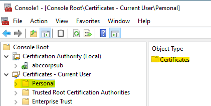 - Under the Personal node, right-click Certificates and select All Tasks >Request New Certificate.