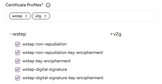 The profiles the Certificate Authority will support for issuing certificates. After selecting a profile group in the Certificate Profiles field, click the plus sign (“+”) to view, select, and unselect the profiles in that group.