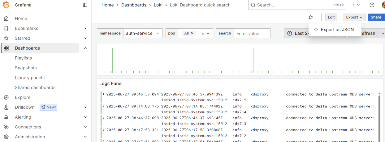 - Select Loki > Loki Dashboard quick search in the content pane.