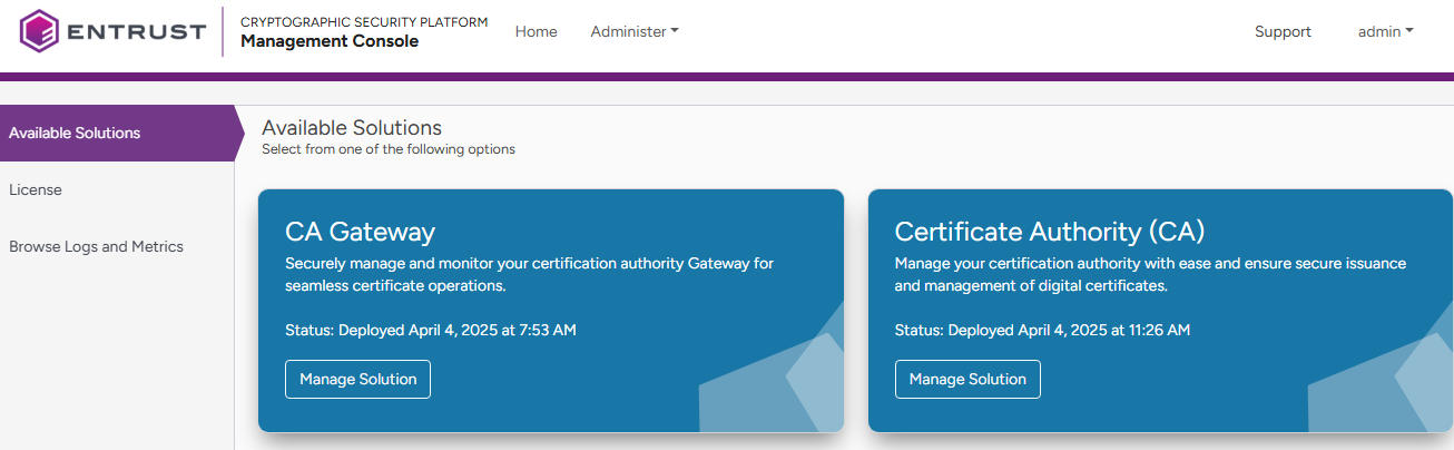 - In the content pane, click Manage Solution under CA Gateway.
