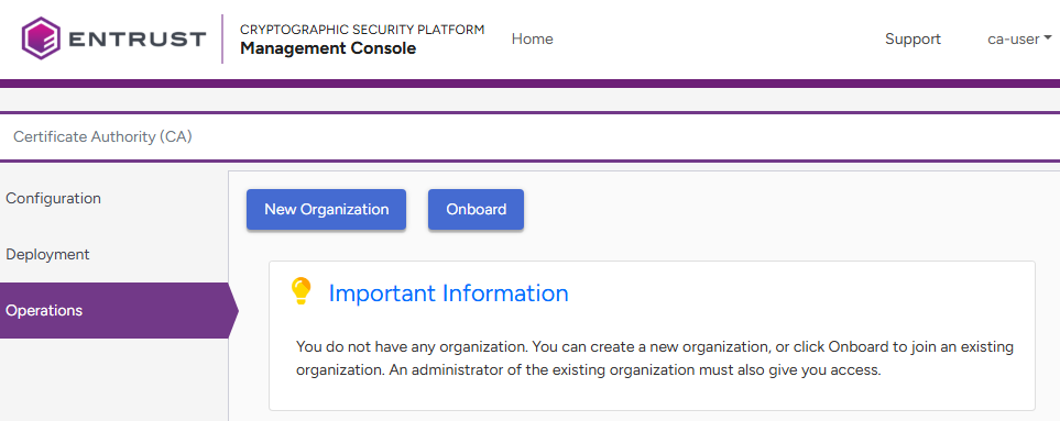<machine>is the IP address or domain name of the machine hosting Cryptographic Security Platform.- Log in to the Management Console as one of the users created in Creating Certificate Authority tenants. This user will be the tenant of the new organization and the Certificate Authorities it contains.