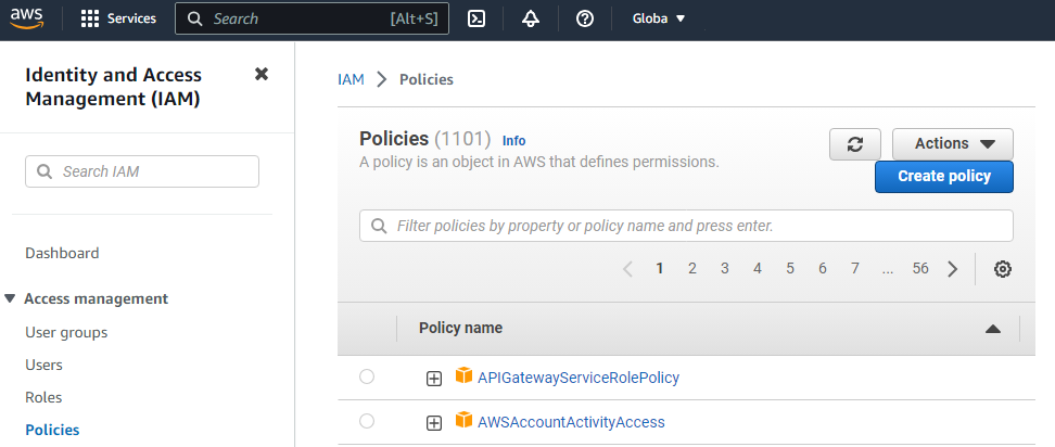 - In the content pane, click the name of an existing IAM policy or click Create policy to create a new one.