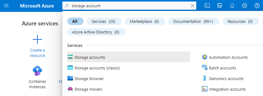 - Type "storage accounts" in the Azure search bar.