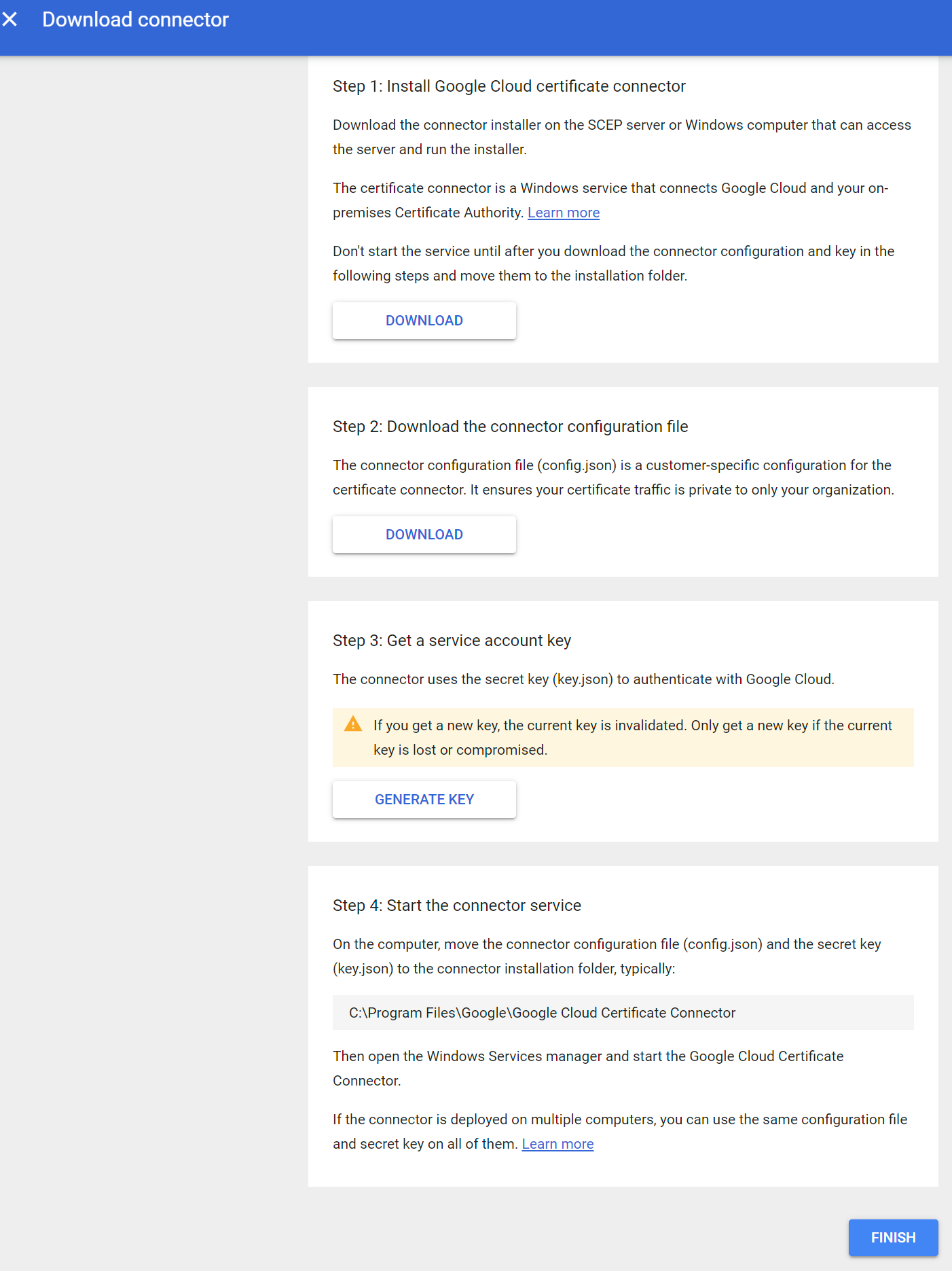 config.json) for Google Cloud Certificate Connector. - In the Step 3 pane, click GENERATE KEY to generate and download a key file (