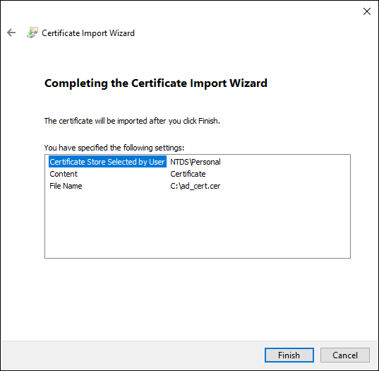 The Certificate Store page appears. - The NTDS\Personal certificate store is already selected. Click Next.