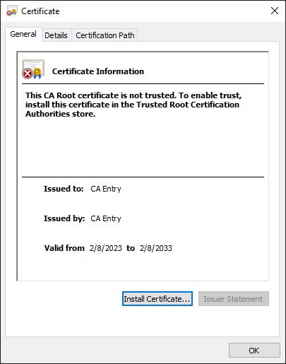 For Active Directory to trust the server certificate, you must install the CA certificate chain for the certificate into the server hosting Active Directory. You must install the entire CA certificate chain, from the root CA to the issuing CA (the CA that issued the server certificate). For an on-premises CA, the root CA may be the issuing CA. You must install the CA certificate chain into Active Directory before you install the server certificate.