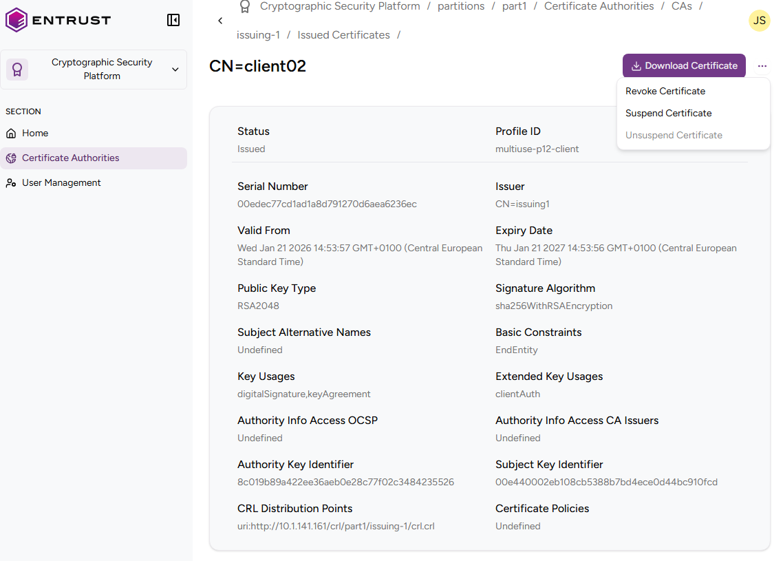 - Suspend Certificate to temporarily invalidate a certificate.
