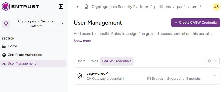 - Click User Management in the sidebar and select the CAGW Credentials tab.