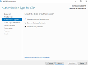 The Authentication Type for CEP page appears. Select an authentication method supported by Certificate Enrollment Gateway.