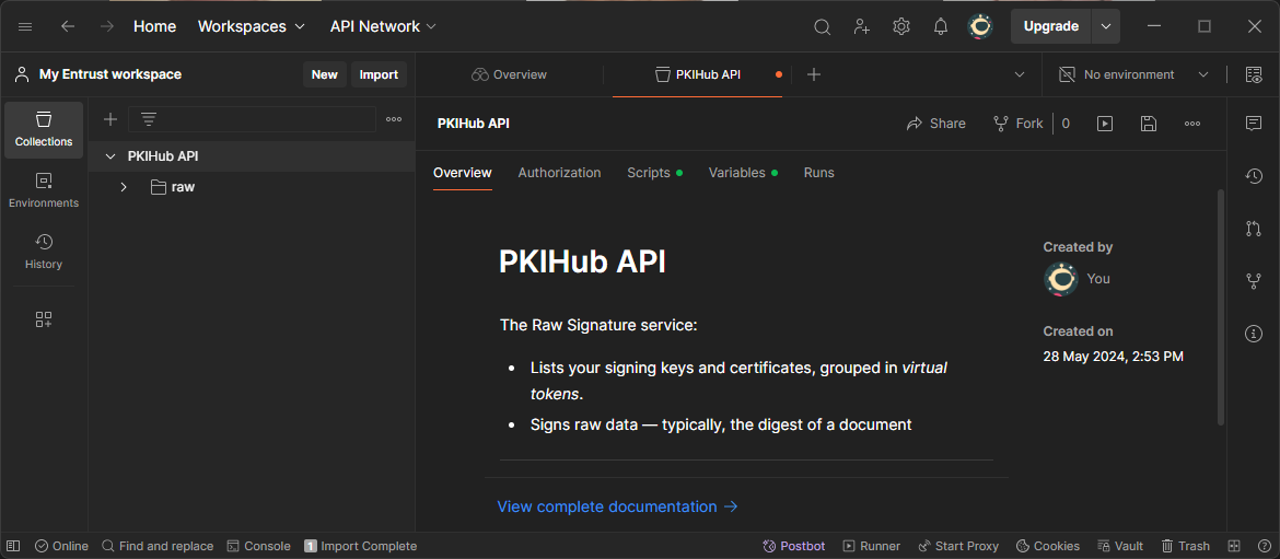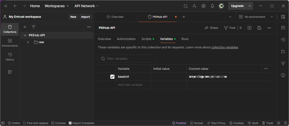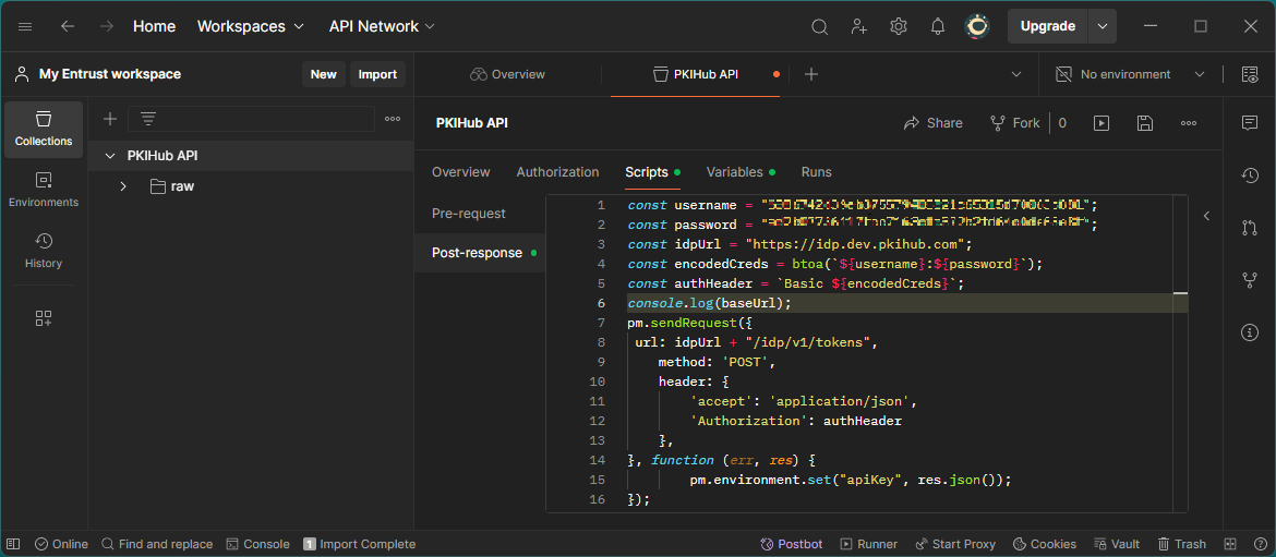 const username = "<subjectId>";const password = "<password>";const idpUrl = "<idpUrl>";const baseUrl = pm.variables.get('baseUrl');const encodedCreds = btoa(`${username}:${password}`);const authHeader = `Basic ${encodedCreds}`;console.log(baseUrl);pm.sendRequest({ url: idpUrl + "/idp/v1/tokens",    method: 'POST',    header: { 'accept': 'application/json', 'Authorization': authHeader    },}, function (err, res) {        pm.environment.set("apiKey", res.json());});Where each placeholder corresponds to the following value.