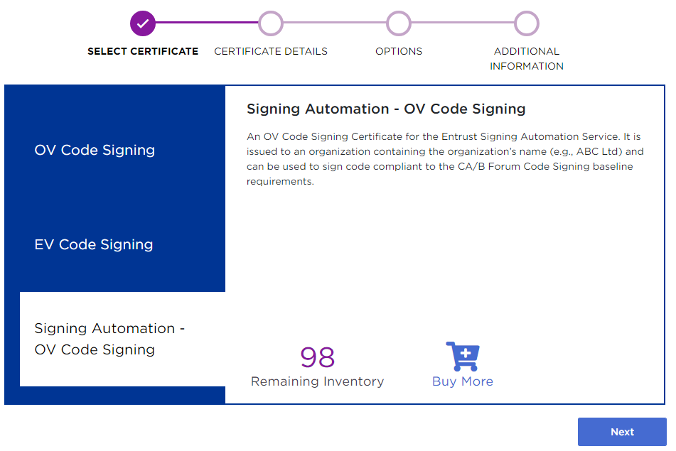 In the Remaining Inventory section of this page, check the number of certificates you can create. Click Next if you still have remaining certificates.