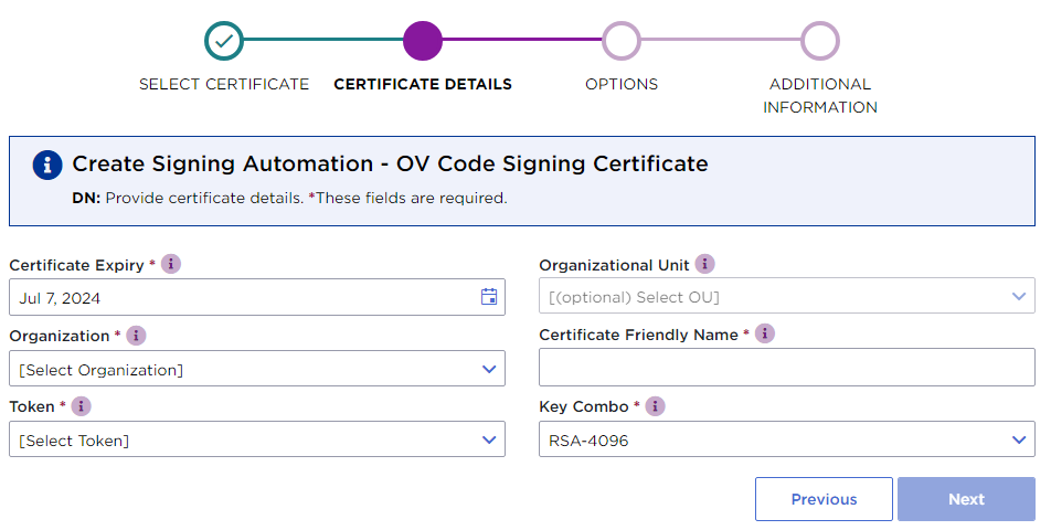 In the sidebar menu, click Signing Automation - OV Code Signing .