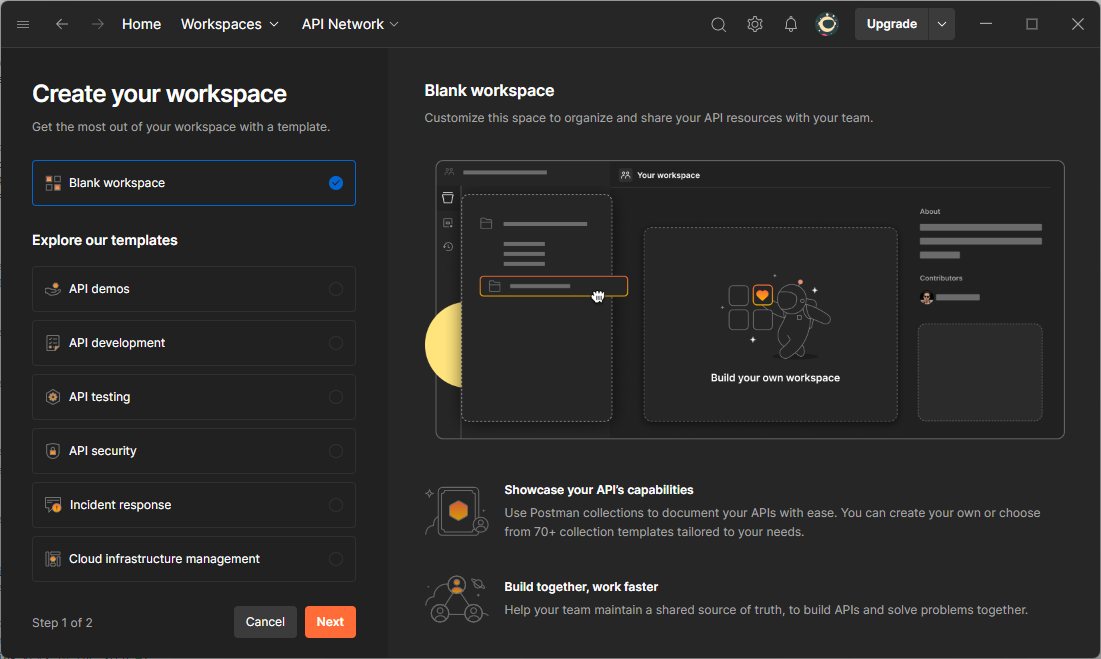 - Select Blank workspace and click Next.