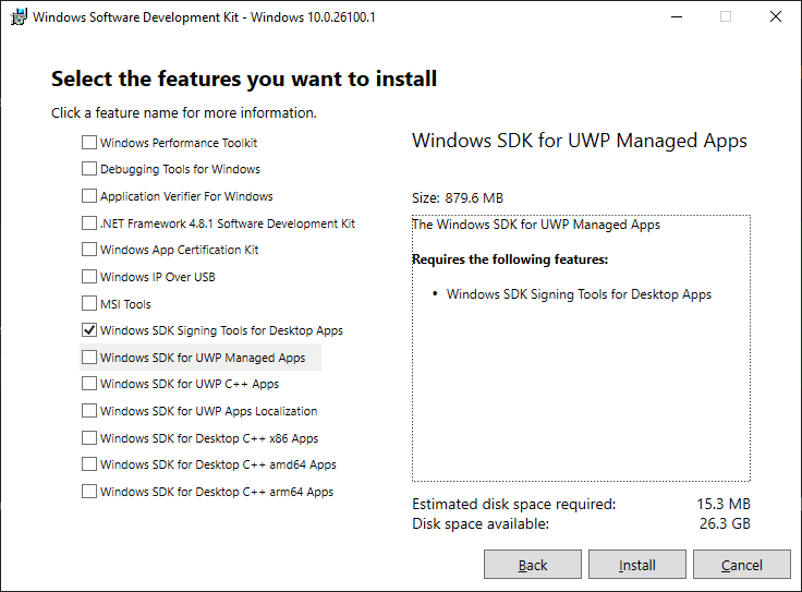 - Complete the steps of the installation wizard. In the Select the features you want install dialog, you only need to check the Windows SDK Signing Tools for Desktop Apps box.