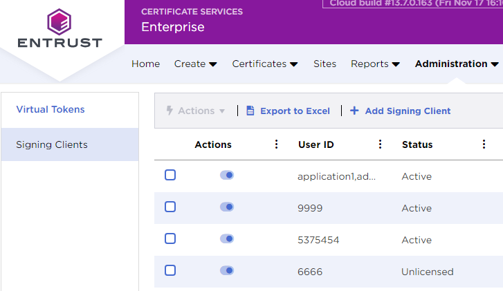 In the Entrust Certificate Services web portal, register a Signing Client with permission on the keys and certificates of a Virtual Token.