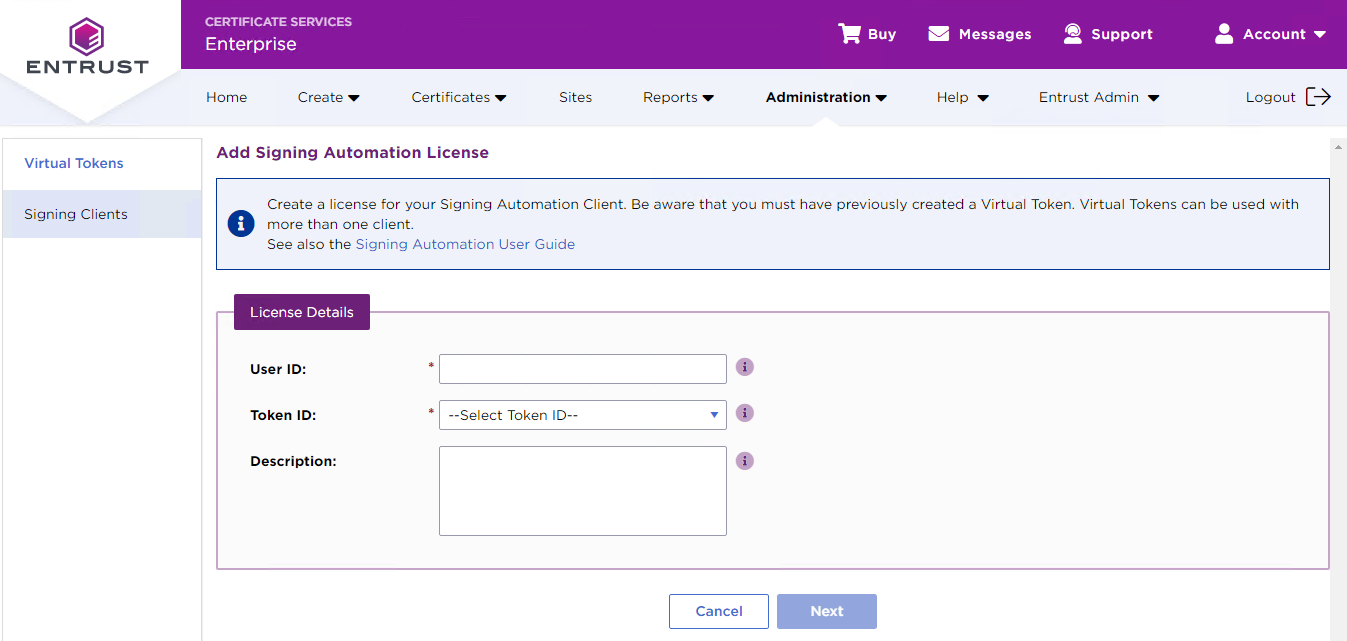 - In the menu bar, click + Add Signing Client to display the Add Signing Automation License form.