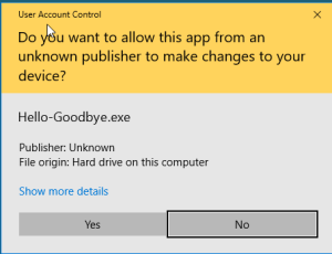 Windows SmartScreen displays a warning like the following when an application executable is not signed.