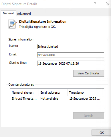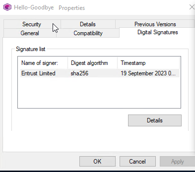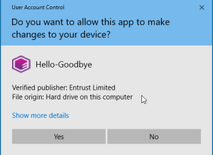 When running the signed executable on a Windows machine, the confirmation dialog will display information on the file signer.